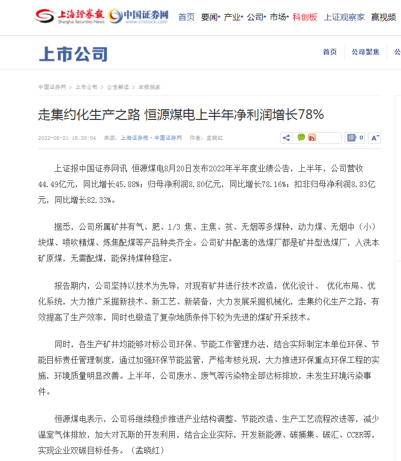 中国证券网2022年8月21日报道,走集约化生产之路 乐鱼煤电上半年净利润增长78%