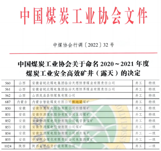 近日,《中国煤炭工业协会关于命名2020-2021年度煤炭工业安全高效矿井(露天)的决定》印发,公司5对煤矿全部被命名为安全高效矿井。
