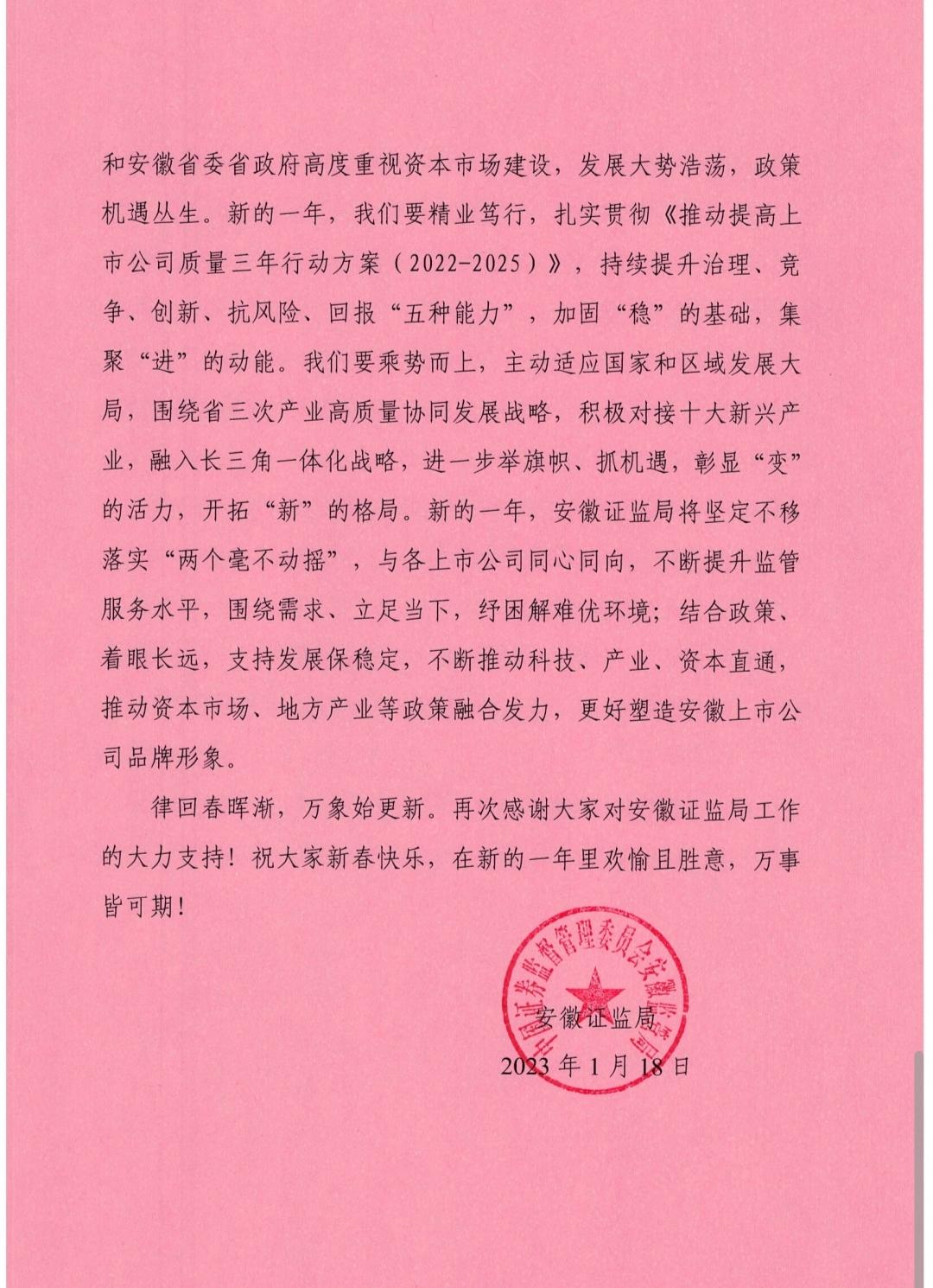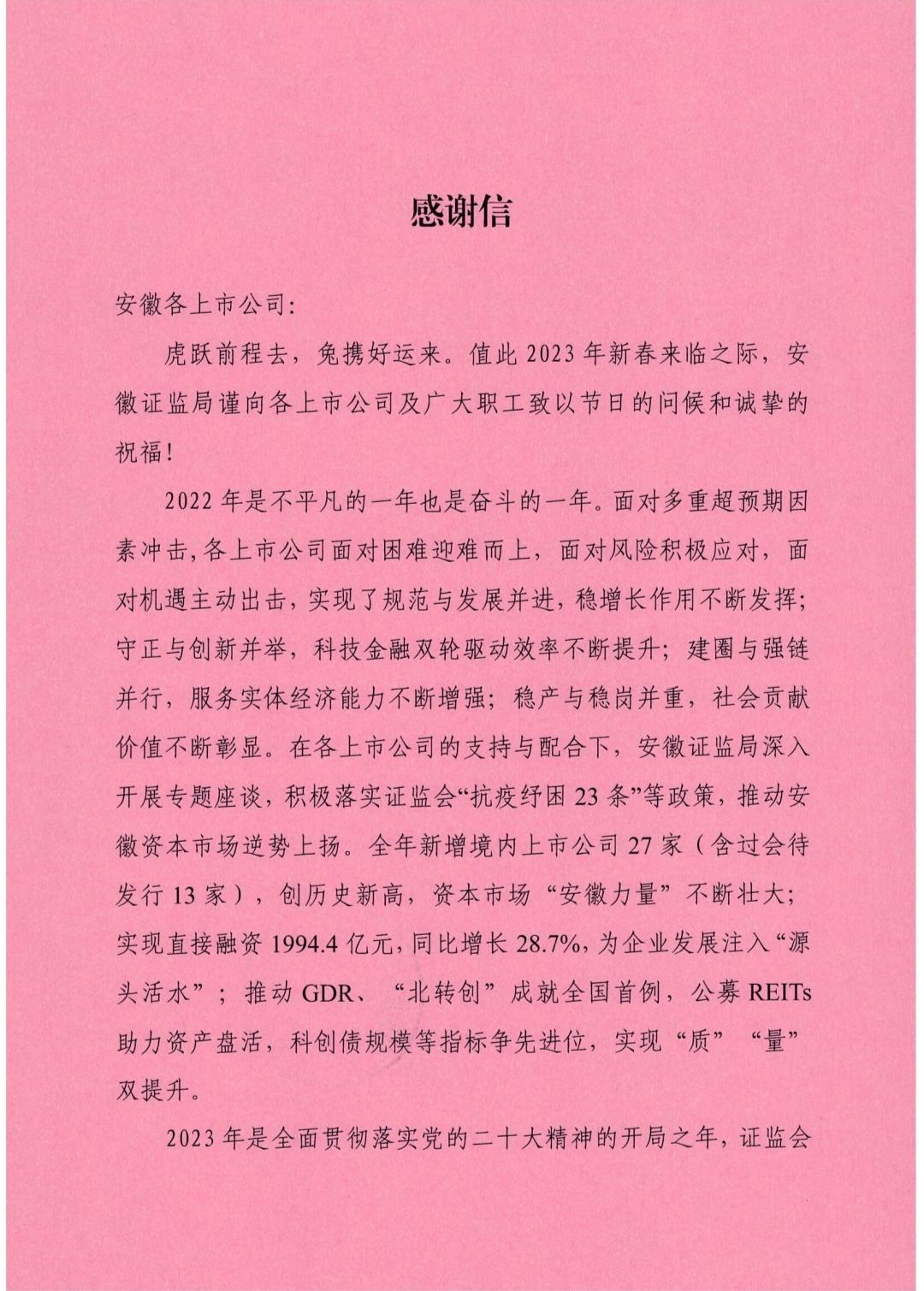 《感谢信》来自安徽证监局。“在2023年新春来临之际,我们向辖区各上市公司寄送《感谢信》,送去节日的问候和祝福。”安徽证监局有关负责人表示,2022年是不平凡的一年也是奋斗的一年。面对多重超预期因素冲击,各上市公司面对困难迎难而上,面对风险积极应对,面对机遇主动出击,实现了规范与发展并进,稳增长作用不断发挥;守正与创新并举,科技金融双轮驱动效率不断提升;建圈与强链并行,服务实体经济能力不断增强;稳产与稳岗并重,社会贡献价值不断彰显。