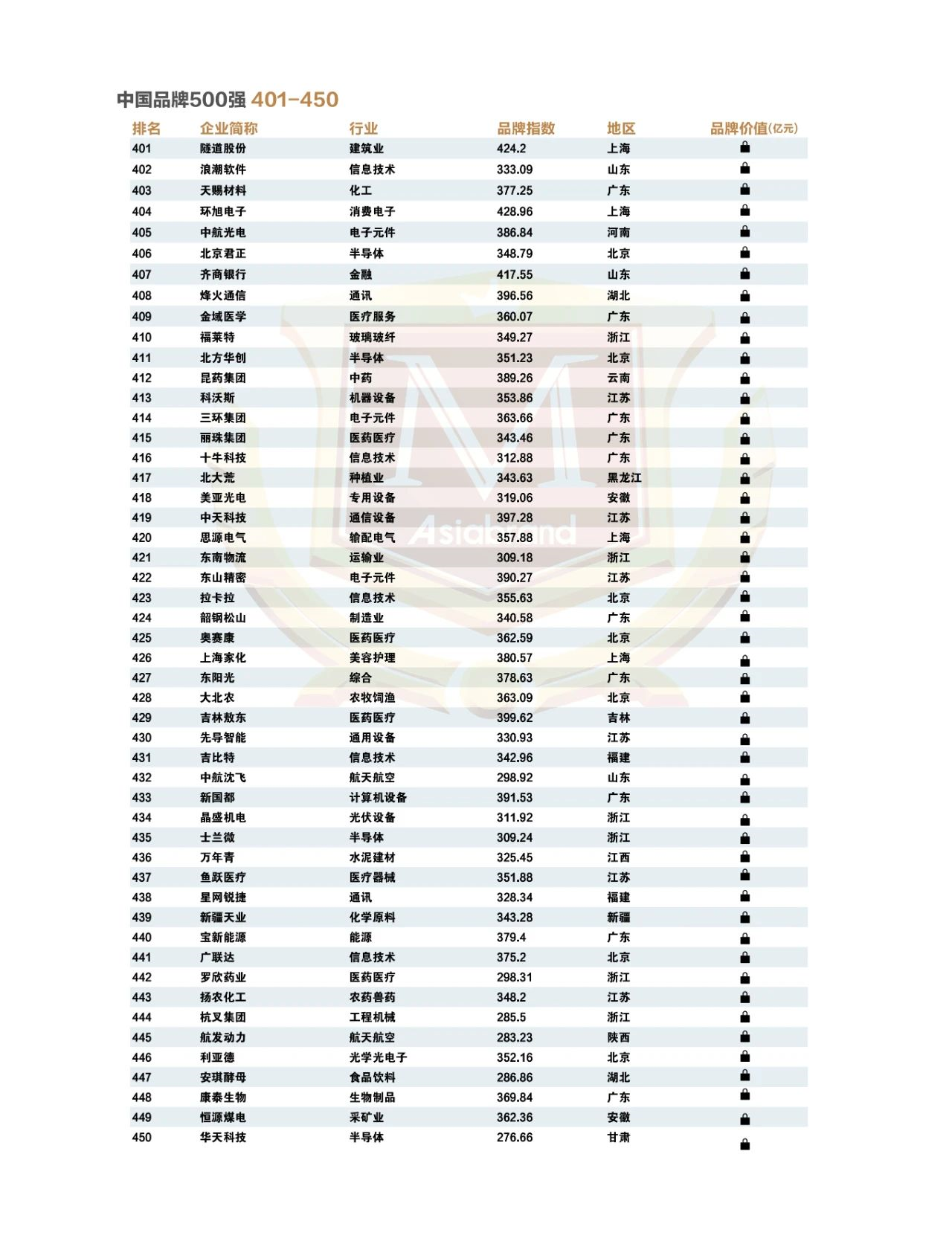 品牌是企业乃至国家竞争力的综合体现,是参与全球竞争的重要资源。Asiabrand凭借超前的战略眼光和专业技术实力,连续17年发布“亚洲品牌500强”榜单,并陆续推出“中国品牌500强”、“中国上市公司品牌500强”、“世界品牌500强”等权威榜单,为企业战略决策和投融资提供了重要参考,已经成为企业界、学术界和商业投资界关注的重要数据之一。