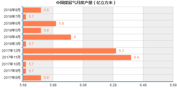 国家统计局数据显示,2018年8月份,全国共实现煤层气产量5.8亿立方米,与去年同期持平,环比增长1.75%;1-8月累计,共实现煤层气产量47.6亿立方米,同比增加6.97%。